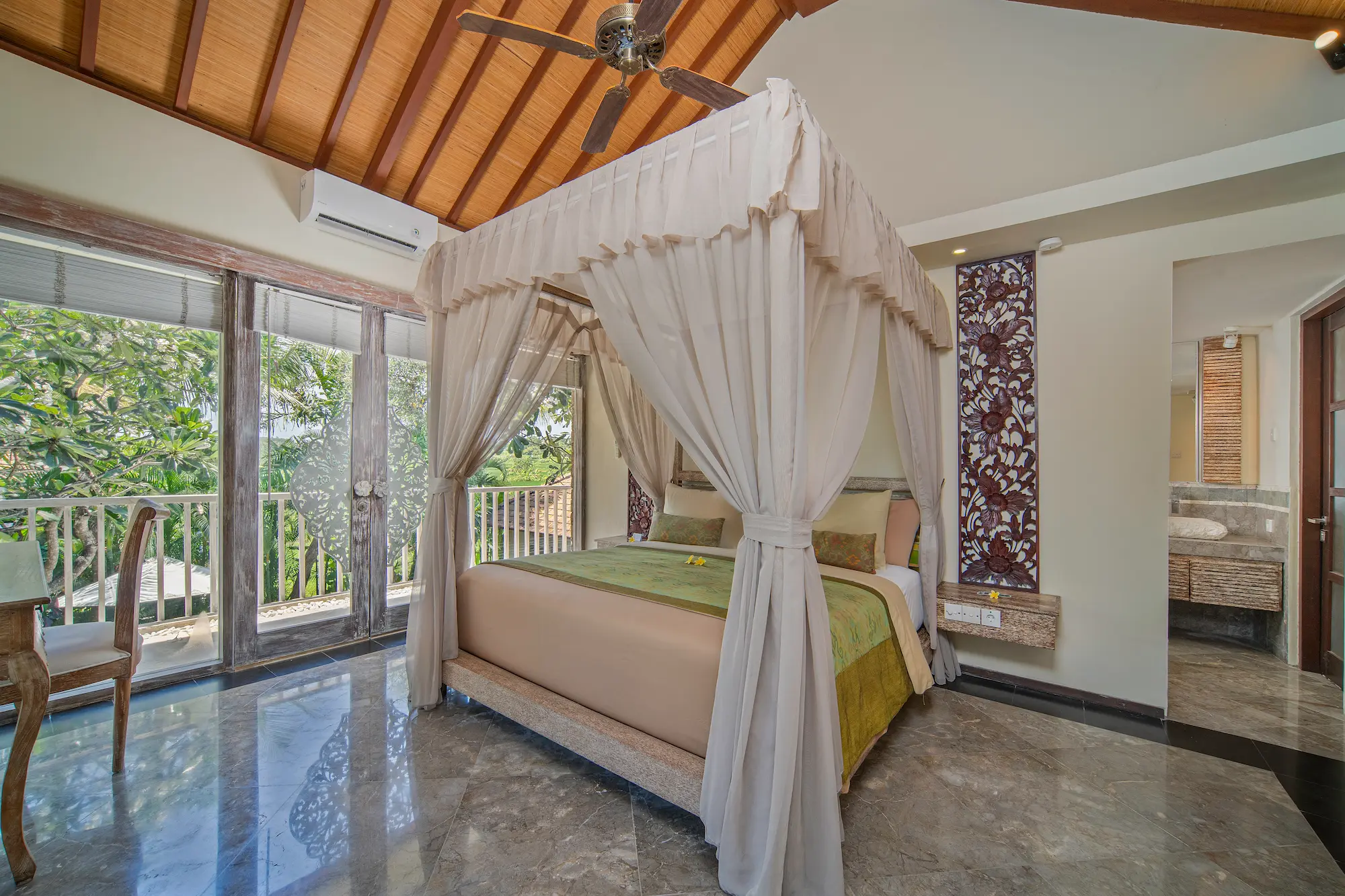 The master suite occupies the upper floor, featuring a king-size bed, an ensuite bathroom, and a private outdoor terrace. Ideal for morning coffee or quiet reflection. On the ground level, two twin-bed guest rooms and a second king-size bedroom each enjoy their own bathrooms, opening to lush tropical gardens.