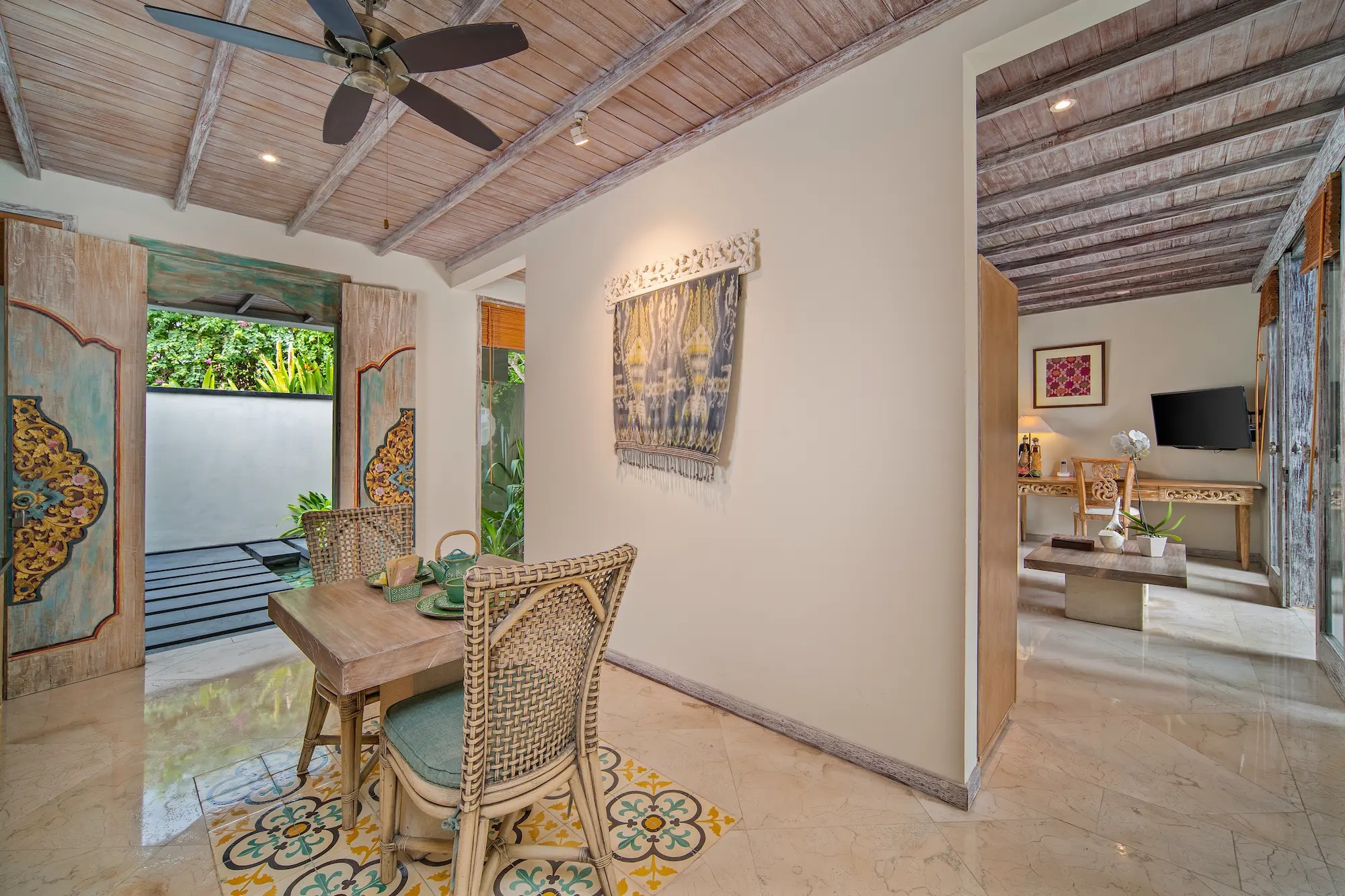 Inside, handcrafted Balinese details and contemporary ease. A spacious bedroom and living area flow into a semi-open-air bathroom, complete with double vanities, oversized granite bathtub, and rain shower. The separate kitchenette and dining space invite slow mornings and late, candlelit dinners.